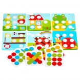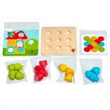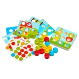 1× Holzsockel mit Löchern, 14× großer, farbiger Holzstift, 12× beidseitige Vorlage (6 perforierte Bilder + 6 farbige Schablonen)