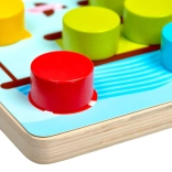 Die großen Holzstifte lassen sich leicht greifen und in die Löcher stecken, was die Hand-Auge-Koordination unterstützt und das Erlernen der Farben durch spielerische Aktivitäten fördert.