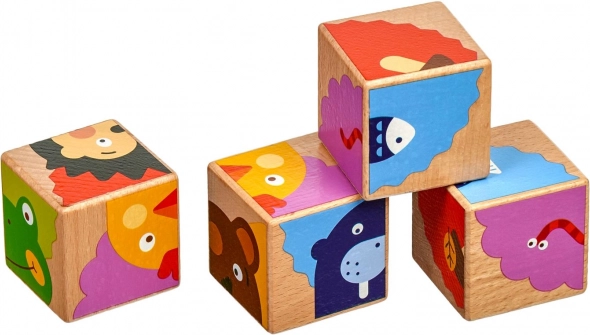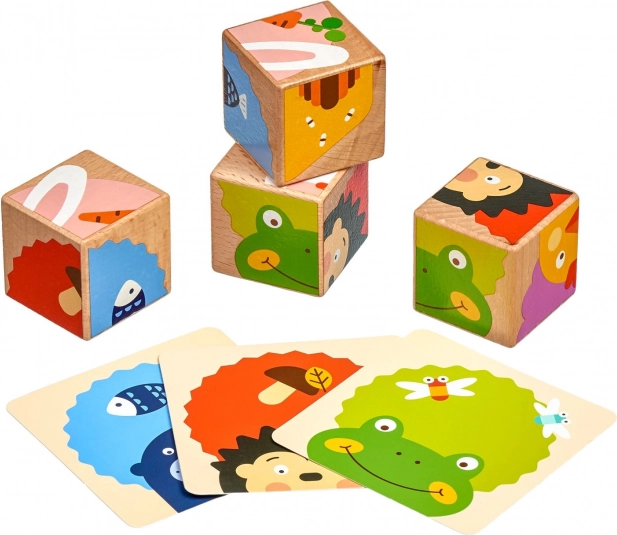 Aus vier Holz-Würfeln setzen Kinder mithilfe der beiliegenden Vorlagen bis zu sechs verschiedene Bilder zusammen. Jede Drehung bringt eine neue, spielerische Aufgabe und hält die Aufmerksamkeit der kleinen Baumeister.