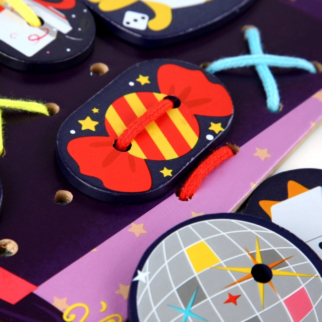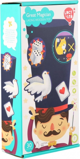 Dieses unterhaltsame Schnür- und Fädelset mit Zauberer-Motiv lädt Kinder in eine Welt der Fantasie ein. Auf der großen Unterlage mit dem Kopf des Zauberers und seinem Hut können sie mithilfe der Schnürsenkel farbige Accessoires befestigen – vom Kaninchen und Münzen bis hin zu geheimnisvollen Karten. Beim Spielen trainieren Kinder Auge-Hand-Koordination, Geduld und Kreativität.