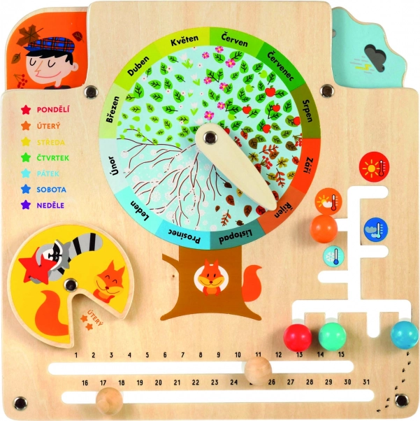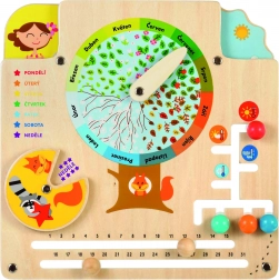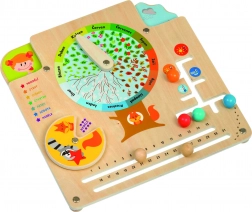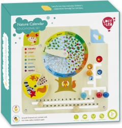 Der Holz-Naturkalender von LUCY & LEO ist ein ideales Hilfsmittel für spielerisches Lernen. In der Mitte des Brettes befindet sich ein laubtragender Obstbaum mit einem 12-Monats-Zeiger, dank dem Kinder leicht den Winter mit Schnee, den Frühling mit Blüten, den Sommer mit Früchten und den Herbst mit fallenden Blättern verbinden. Gleichzeitig lernen Kinder, Wochentage, Anzahl der Tage im Monat, Wetter, Temperatur und passende Kleidung für verschiedene Bedingungen zu erkennen.
