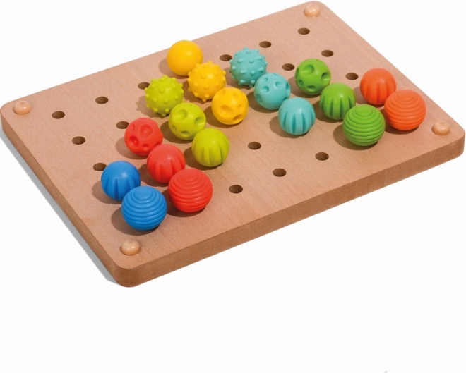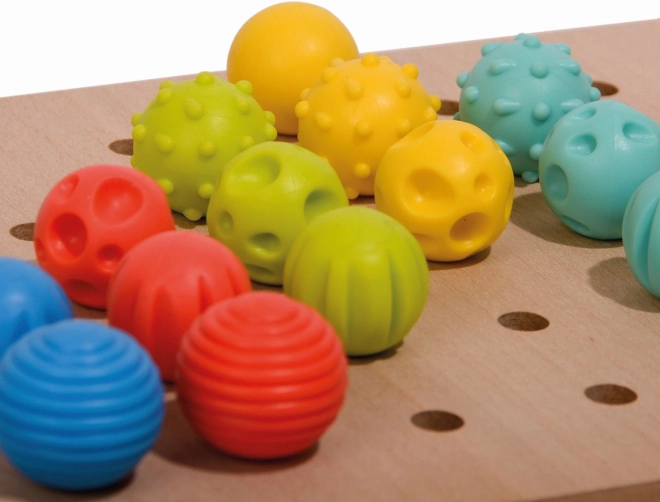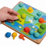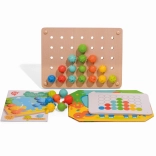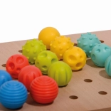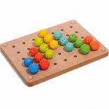 Die Holzplatte mit Löchern ermöglicht das einfache Platzieren der Stifte, während farbige Schnürsenkel eine weitere Spielebene hinzufügen – das Fädeln. Die Eigenschaften dieses Spielzeugs machen es zu einem großartigen Lernmittel, das auch in Montessori-Umgebungen verwendet wird.