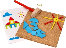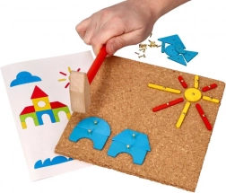 Kinder verbessern ihre Feinmotorik und Hand-Augen-Koordination, indem sie verschiedene Formen und Bilder auf der Korkplatte zusammenstellen.