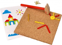 Goki Nagelspiel Lustiges Haus ist ein kreatives Spielzeug, das Kindern die Möglichkeit gibt, verschiedene Designs mithilfe bunter Holzformen und einer Korkplatte zu erstellen. Es hilft, die Feinmotorik und Kreativität zu entwickeln.