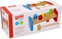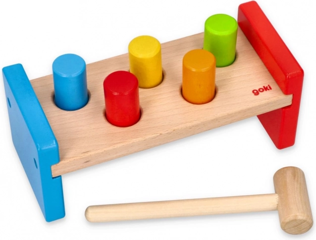 Diese robuste Klopfbank besteht aus widerstandsfähigem, glatt verarbeitetem Holz mit sicheren, ungiftigen Farben. Mit dem Holzhammer können Kinder Griff, Schlagkraft und Geduld trainieren, während die farbigen Stifte zu wiederholtem Spiel einladen.