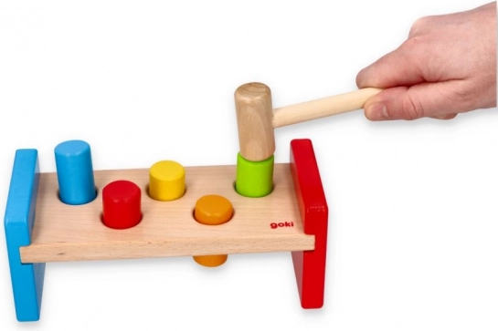 Die klassische Holz-Klopfbank der Marke Goki fördert spielerisch die Feinmotorik, die Hand-Auge-Koordination und die Konzentration. Bunte Stifte aus hochwertig lackiertem Holz werden mit einem Holzhammer in die Öffnungen geklopft – der Spielspaß kann beginnen. Die ideale erste Lernspielzeug für Kinder ab 2 Jahren.