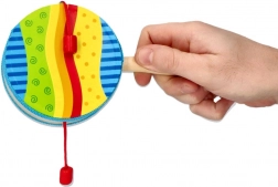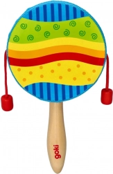 Die traditionelle „Schnurtrommel“ in modernem Design von GOKI ist ein großartiges Begleitinstrument für Kinder. Drehe den Griff, und die roten Perlen an den Schnüren schlagen rhythmisch auf das Trommelfell. Die Drehgeschwindigkeit verändert natürlich Tempo und Klangcharakter, was Hörwahrnehmung und Rhythmusgefühl fördert.