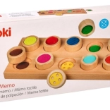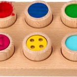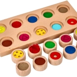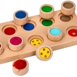 Jeder der 10 Holzzylinder hat eine andere Oberfläche. Kinder trainieren den Tastsinn und das Vergleichen, wenn sie blind die passende Öffnung auf der Platte suchen.