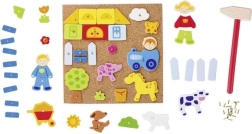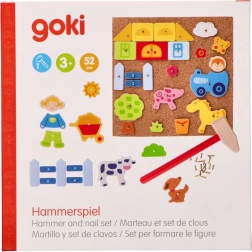 Dieses originelle Goki Hammer-Spiel bietet stundenlangen Spaß und Kreativität für Kinder. Das Set enthält insgesamt 52 Teile – Holzformen, Nägel, Korkunterlage und Hammer, was es ermöglicht, verschiedene Bilder mit Tieren, Bauernhof und anderen Motiven zu erstellen.