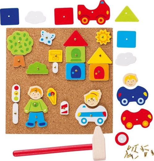 Das Korkhammer-Set Stadt ist ein unterhaltsames und lehrreiches Set für Kinder ab 3 Jahren. Dieses Set enthält bunte Holzformen, die Kinder auf die Korkplatte hämmern können.