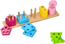 Dieses hölzerne Sortierpuzzle verbindet das Erlernen von Farben und geometrischen Formen mit dem praktischen Aufstecken von Teilen mit unterschiedlich vielen Löchern auf die Stifte. Beim Spielen trainieren Kinder Feinmotorik, Griff, Augen–Hand-Koordination und Logik.