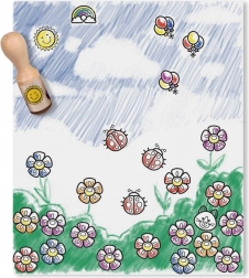 Robuste Holzkörper mit Motiven wie Sonne, Herz oder Schmetterling sorgen für einen angenehmen Griff und schöne Abdrücke auf Papier.