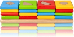 Vier Türme mit quadratischen Plättchen und unterschiedlich geformten Öffnungen helfen Kindern, Farben und Formen auf natürliche, spielerische Weise zu unterscheiden.