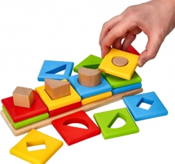 Massivholz und die robuste Ausführung gewährleisten Langlebigkeit und sicheres Spielen. Das Set enthält eine Grundplatte und 16 farbige Quadrate, die nach Form und Farbe gesteckt, sortiert und kombiniert werden können – ideal für Montessori-inspiriertes Lernen zu Hause und im Kindergarten.
