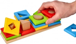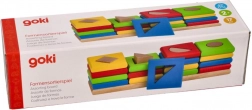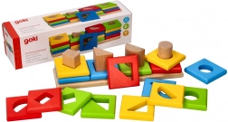 Dieses hochwertige Holzpuzzle der Marke GOKI verbindet Lernen und Spiel. Vier Stäbe mit farbigen quadratischen Plättchen und verschiedenen Öffnungen (Kreis, Dreieck, Quadrat u. a.) lehren Kinder, Formen und Farben zu erkennen, während sie Auge-Hand-Koordination und Bewegungspräzision entwickeln.