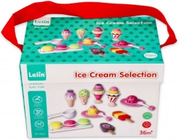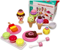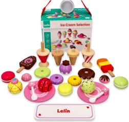 Mit dem eleganten Eiscreme-Set aus Holz der Marke Lelin wird jedes Kind zum Eisverkäufer. Dieses Set enthält 25 bunte Teile und ist ideal für Kinder ab 3 Jahren. Die Spielzeuge sind aus lackiertem Holz gefertigt und in einer stabilen Box mit komfortablem Klappverschluss und Griff für leichtes Tragen verpackt.