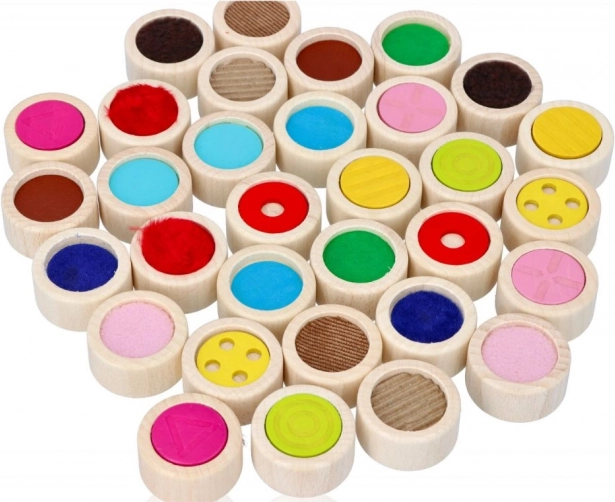Das hölzerne Tast-Memo-Spiel ist ideal zur Stimulierung taktiler und sensorischer Reize. Die Spielsteine in Form von Zylindern aus massivem Holz haben einen Durchmesser von 4 cm und 16 verschiedenen Oberflächen. Das Spiel kann mit geschlossenen Augen als Herausforderung gespielt werden, um die gleiche Oberfläche zu finden, oder als klassisches Memo, indem die Steine mit der bunten Seite nach unten gelegt werden.