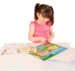 Die Aufkleber lassen sich beliebig oft neu platzieren und verschieben, sodass Kinder die Geschichte leicht verändern und neue Szenen komponieren können.