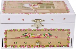 Dieses bezaubernde Schmuckkästchen im Stil einer Spieluhr beeindruckt durch sein zartes Design und die magische Überraschung im Inneren. Beim Öffnen des Deckels startet die klassische Melodie Schwanensee und die kleine Ballerina beginnt sich vor dem Spiegel zu drehen. Dank der Schublade und der unterteilten Fächer lassen sich Ringe, Armbänder und weitere Schätze leicht verstauen.