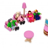 Holzfiguren in farbigem Textil und flexible Arme und Beine erleichtern das Posieren und Sitzen im Puppenhaus.