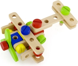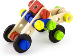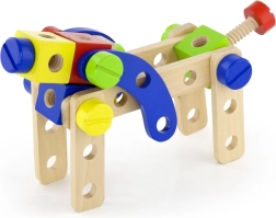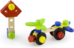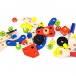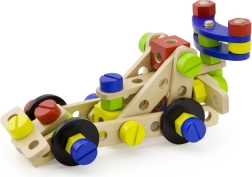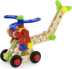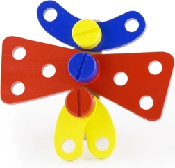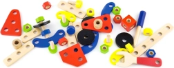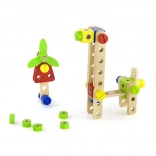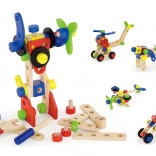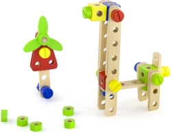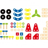Eine bunte Auswahl an Schrauben, Muttern, Plättchen und Rädern ermöglicht den Bau dutzender Modelle – von Tieren über kleine Fahrzeuge bis hin zu Hubschraubern. Ideal zur Förderung von Fantasie und Geduld.