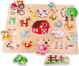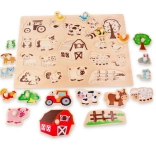 Dieses robuste Holzsteckpuzzle bietet Kindern eine erste Begegnung mit der Welt des Bauernhofs. Farbige, lackierte Teile mit klaren Konturen passen leicht in die Grundplatte aus Naturholz. Dank der Griffe liegen die Teile auch in kleinen Händen gut, was die Feinmotorik und die Geduld fördert.