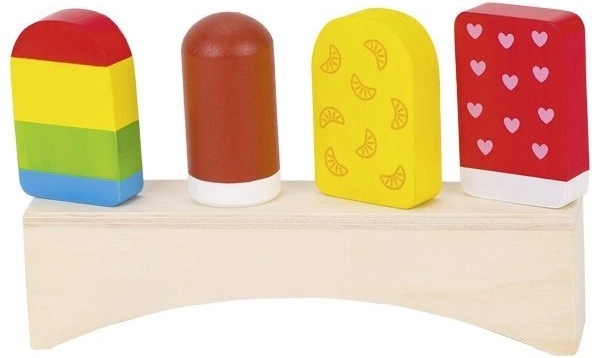 Genießen Sie den Sommer mit bunten Holz-Eis am Stiel auf einem Ständer. Das Set enthält 4 verschiedene Eis am Stiel und eine Holzbasis zur stilvollen Präsentation.
