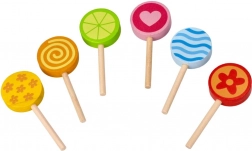 Jeder der sechs Holzlutscher hat ein eigenes einzigartiges Design, das die Fantasie und Kreativität der Kinder inspiriert.