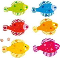 Ein lustiges und lehrreiches Spielzeug aus buntem Holz von GOKI bietet Kindern die Möglichkeit mit bunten Puzzle-Fischen und Würfeln zu spielen, die Kreativität und Hand-Augen-Koordination fördern.
