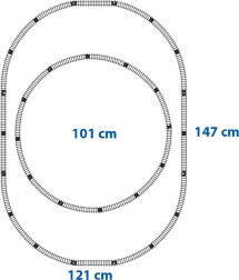 Das Schienensystem ermöglicht die Erstellung zweier Kreisläufe, eines inneren mit den Maßen 101 cm und eines äußeren mit 147 cm.