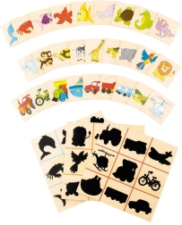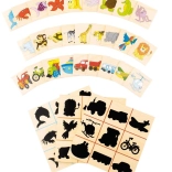 Bunte Holzplättchen mit Illustrationen von Tieren und Fahrzeugen werden den passenden Schatten zugeordnet. Eine spielerische Form, die das Formenunterscheiden unterstützt und die Aufmerksamkeit trainiert.
