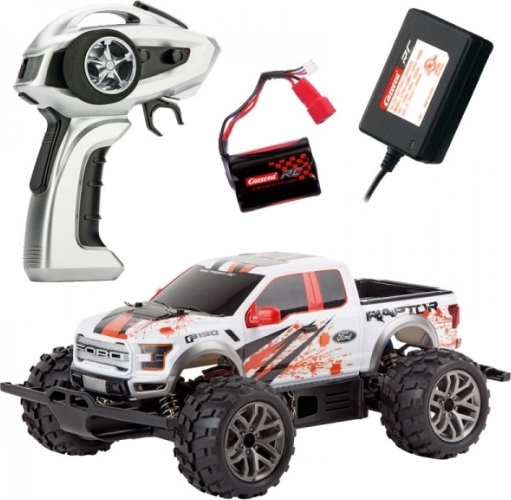 Erleben Sie adrenalintreibende Fahrten mit dem RC-Modell FORD F‑150 RAPTOR aus der Carrera RC PROFI Serie. Dieses robuste Offroad-Fahrzeug bietet Geschwindigkeiten bis zu 50 km/h, Allradantrieb (4WD), Öldruckstoßdämpfer und ein wasserfestes Design für sorgenfreien Fahrspaß im Gelände. Dank des RTR – auspacken und losfahren-Sets ist alles Nötige im Lieferumfang enthalten, einschließlich wiederaufladbarem Akku und USB-Ladegerät.