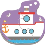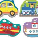 Jedes Puzzle stellt ein anderes Verkehrsmittel dar – Auto, Zug, Flugzeug und Schiff – und fördert das kreative Spiel.