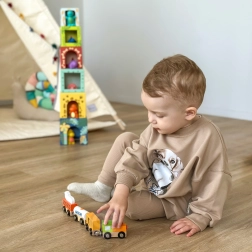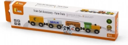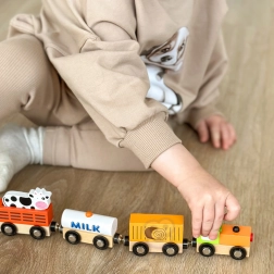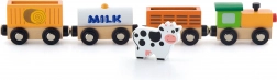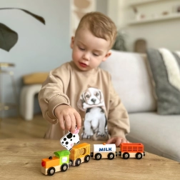 Das Set enthält eine Lokomotive und drei Waggons – eine mit MILK gekennzeichnete Cisterne, einen Viehwagen mit Kuh und einen Güterwagen. Glatte Kanten und robuste Ausführung sind ideal fürs Kinderzimmer und für Kindergärten.