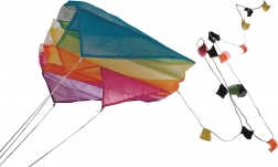 Drachen mit buntem Design ist ideal für windige Herbsttage. Er ist vom Boden aus hervorragend sichtbar, wendig und leicht zusammenzubauen.