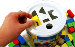 Der Eimerdeckel enthält Formöffnungen, in die Kinder die passenden Bausteine einsetzen. Das unterstützt die Entwicklung der Fähigkeit zur Form- und Mustererkennung.