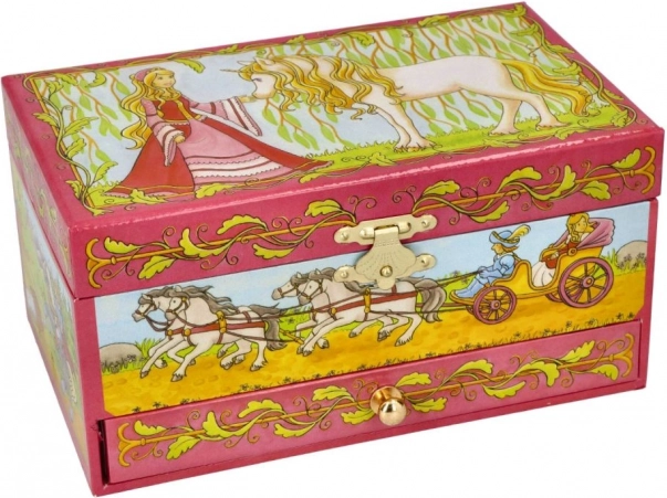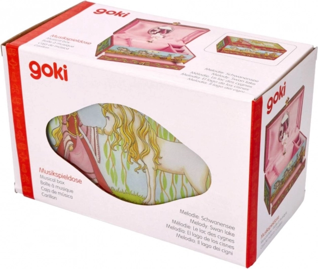Das Schmuckkästchen im Stil einer Spieluhr ist das perfekte Accessoire für kleine Damen, die ihren Schmuck mit Eleganz aufbewahren möchten. Beim Öffnen spielt die Melodie der Oper Schwanensee und das weiße Pferdchen tanzt vor dem Spiegel.