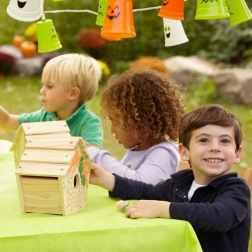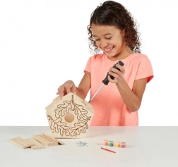 Das Set ermöglicht es Kindern, selbstständig ein Vogelhaus nach ihrer eigenen Fantasie zu bauen und zu dekorieren.
