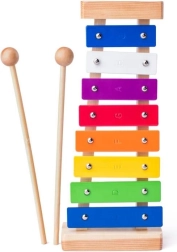 Das Instrument enthält acht Metalltasten in verschiedenen Farben auf einer Holzunterlage. Ausgestattet mit zwei Holzschlägeln ist dieses Produkt für Kinder ab drei Jahren geeignet, die damit gemeinsam spielen und neue Fähigkeiten erlernen können.