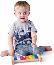 Das Metallophon hat sieben verschiedenfarbige Metalltasten und eine Holzunterlage, was die Aufmerksamkeit des Kindes erregt.