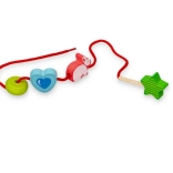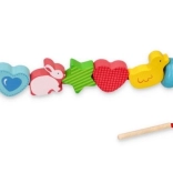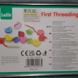 Das Set enthält verschiedene Holzperlen in unterschiedlichen Formen und Farben, die Kinder auf eine Textilschnur mit Holzenden auffädeln können. Dies stärkt die Kreativität und die Vorstellungskraft der Kinder.