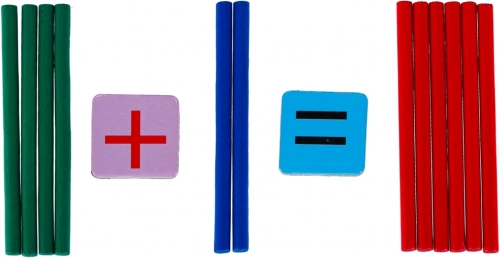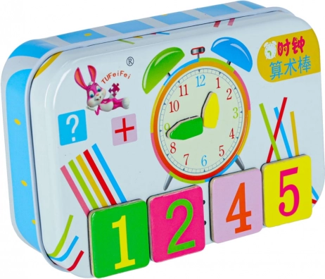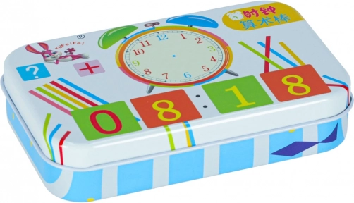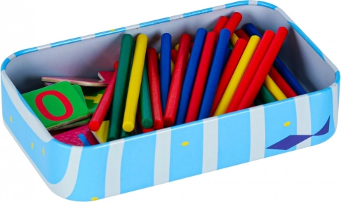- 50 farbige Holzstäbchen, 4× Uhrzeiger, 28 magnetische Kärtchen mit Zahlen und mathematischen Zeichen, Metalletui