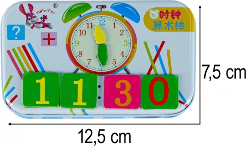 Lernset zum Erlernen der Uhrzeit und des Rechnens für Kinder. Magnetische Kärtchen, Zeiger, Holzstäbchen und Metalletui. Ideal für Schule und unterwegs.