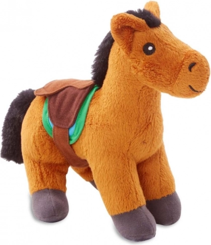 Das Plüschpferd mit angenehmer Oberfläche, grünem Sattel und robusten Details ist ideal zum Kuscheln und Spielen.