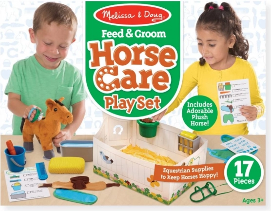 Dieses Pflegeset mit einem weichen Plüschpferd ist das ideale Spielzeug für kleine Pferdefans. Enthaltenes Zubehör wie Bürste, Schwamm, Karotte und Futtertrog unterstützt realistische Bauernhof-Spiele und das Lernen der Tierpflege. Dank der bunten Farben und angenehmen Materialien werden Kinder das Spielen lieben.