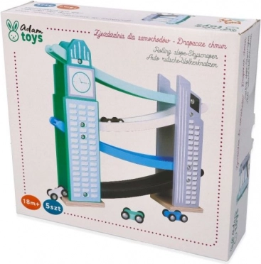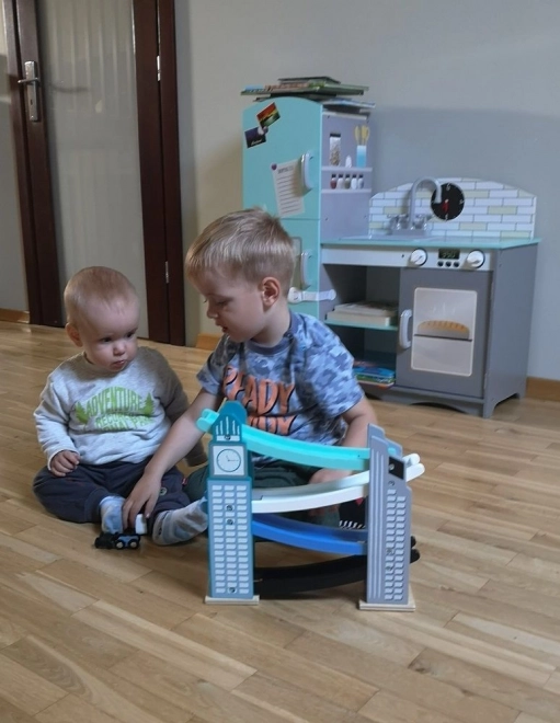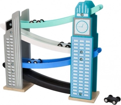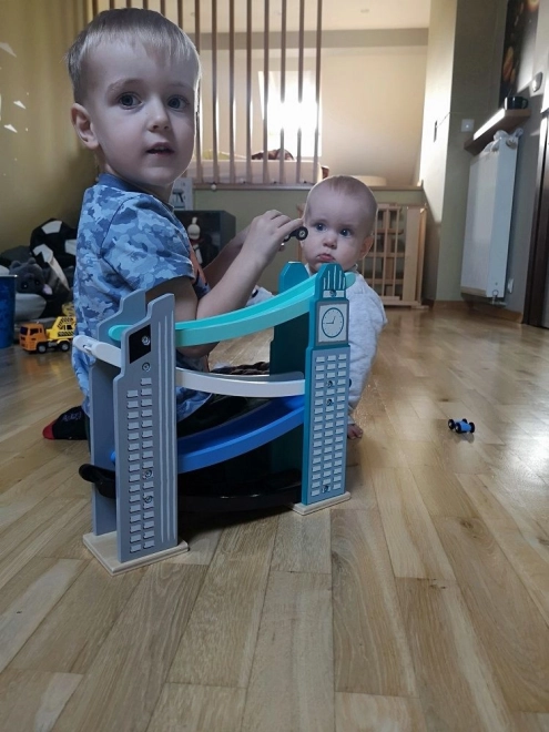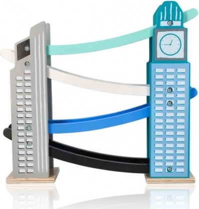 Unsere hölzerne Autorennbahn ist so gestaltet, dass sie ikonischen Stadtbauten ähnelt, einschließlich eines Turms mit Uhr. Sie besteht aus hochwertigem Holz und bietet mehrere Ebenen mit verschiedenfarbigen Rampen in Blau, Schwarz und Weiß. Kinder haben Freude daran, kleine farbige Autos von ganz oben nach unten fahren zu lassen. Die Bahn bietet nicht nur Spaß, sondern fördert auch die Feinmotorik und vermittelt physikalische Prinzipien wie Gravitation und Geschwindigkeit.