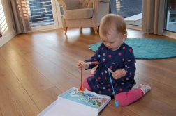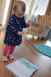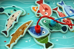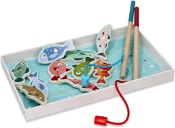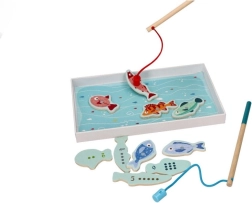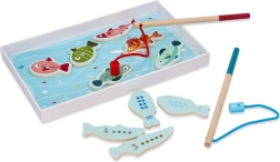 Beim Spielen verwendet das Kind eine Holzangel mit Magnet, was die Entwicklung von Hand-Auge-Koordination und Feinmotorik unterstützt.