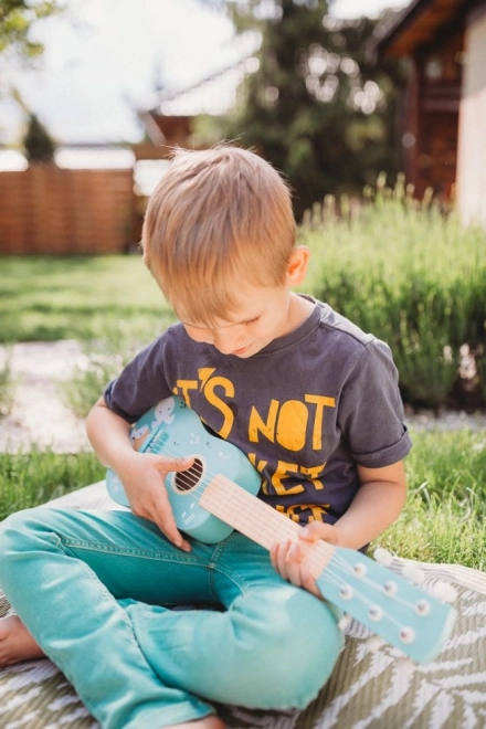 Niedliche Holzgitarre für Kinder in Türkis mit Tierillustrationen motiviert kleine Musiker, die Welt der Musik zu entdecken. Bietet ein robustes Holzgehäuse, echte Saiten und angenehme Handhabung – ideal für erste musikalische Versuche und die Förderung von Rhythmusgefühl und Kreativität.