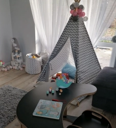 Robuste Holzteile mit glatten Kanten, CE-Zertifizierung und eine sanfte Farbpalette sorgen für ein sicheres und ästhetisches Spiel, das dem täglichen Gebrauch standhält.