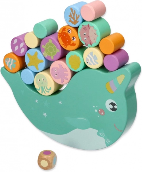 Kinder stapeln Holzzylinder auf eine schaukelnde Basis in Form eines Narwals und trainieren Feinmotorik, Koordination sowie das Einschätzungsvermögen. Jeder Zug ist eine Herausforderung, die Stabilität zu bewahren.